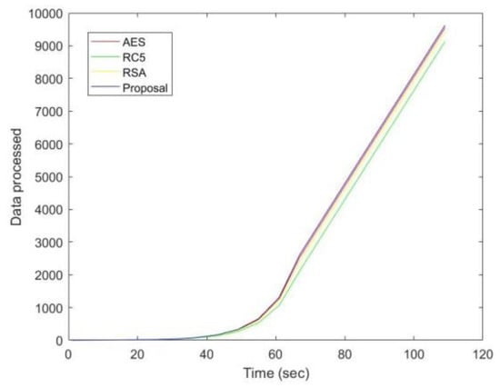 Performance of data processed (megabytes) comparison of the AES, RC5, RSA, and proposed model.