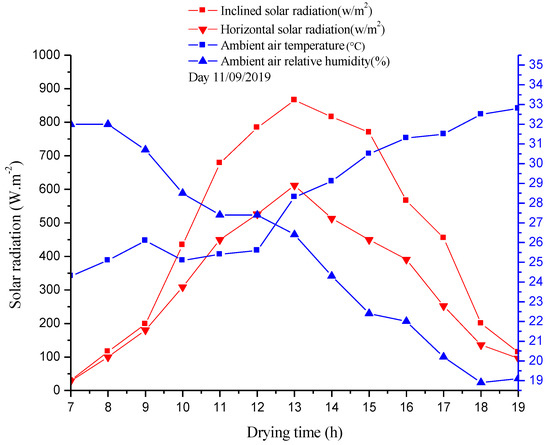 The fruit samples’ initial and final moisture contents of the Arbutus unedo L. varied from 1.8857 to 2.0834% d.b and from 0.8857 to 0.6041% d.b, respectively. The horizontal solar radiation was lower than the inclined one during the daytime (Figure 2).