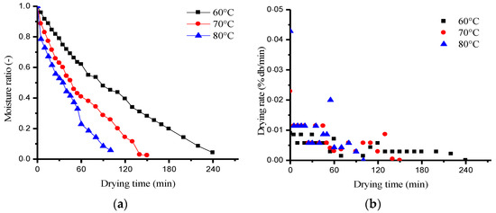 The trend of the moisture ratio (a) and drying rate (b) with drying time at 60 °C, 70 °C, and 80 °C.
