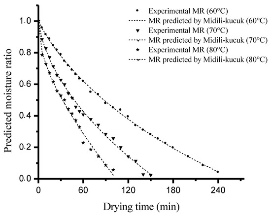 Experimental drying data of moisture ratio versus drying time as fitted with Midilli-Kucuk model.