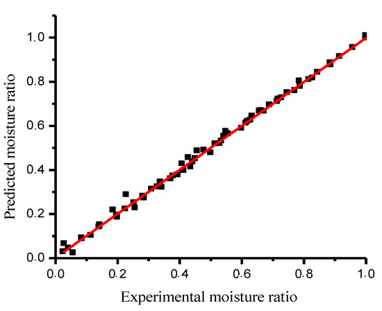 Relationship between moisture ratios as predicted by Midilli-Kucuk model and the observed moisture ratio of the Arbutus unedo L. at temperatures (R² = 0.9998).