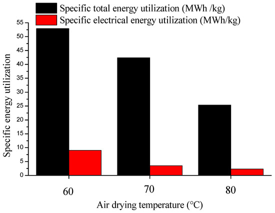 The specific thermal energy (kWh/kg) required to remove one kilogram of mass of water from the product was calculated by using Equation (12) [48]: