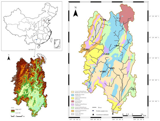 This study examined a typical small karst catchment area in Guangxi Province as an example. Catchment sediment samples were collected from the same site as part of the three geochemical baseline projects (EGMON, CGB1, and CGB2). These samples likely reflect the temporal variations in the catchment sediments. In order to trace the sources of the sediments, representative rock and soil profile samples were collected from the upstream catchment, and geochemical indexes were calculated for each one. Accordingly, the dynamic variations of toxic metal concentration in the small karst catchment were studied. Moreover, a geochemical provenance model was established for the catchment, using the Sediment Identification Fingerprint Tool (SIFT) [24] to explore temporal variations of sediment provenance in a typical small karst catchment area over the past 28 years (1992–2019). In this research, temporal variations of sediment provenance in a karst watershed supply for a long period of time was explored, aiming to provide information on the sources and changing trends of sediments and a geochemical basis for the prevention and controlling of toxic metal pollution in Guangxi.