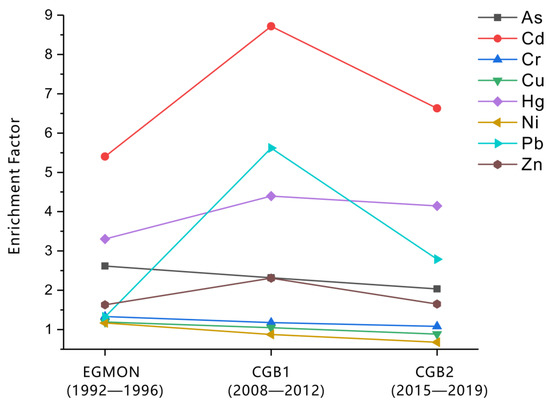 The catchment sediment samples collected in different periods were all very fine-grained and brownish-yellow in color. The CGB1 and CGB2 catchment sediment samples had pH values of 4.83 and 4.64, respectively (pH was not measured in EGMON). The enrichment factor (EF) of toxic metals of catchment sediments (Figure 2) were calculated using the mean contents of toxic metals in catchment sediments in China [32] as denominator, with Al as the reference element to eliminate the grain-size effect. Concentrations of Cr in all three periods were below the background level, while Ni and Cu were depleted and other elements, including As, Cd, Hg, Pb, and Zn, were enriched. In EGMON (1992–1996), Hg and Cd were enriched to a relatively high level with enrichment factors of 3.3 and 5.4, respectively. In CGB1 (2008–2012), Pb, Hg, and Cd showed strong enrichment and in CGB2 (2015–2019), Hg and Cd were moderately enriched. In general, the environmental quality of soil in the study area, in terms of toxic metals, was the best during 1992–1996, followed by 2015–2019, and the worst during 2008–2012.