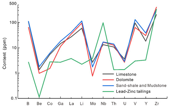 From the geological background of the study area, four major sources (limestone, dolomite, sand-shale and mudstone, and lead-zinc tailings) were identified as possible contributors of catchment sediments. Based on the elements/oxides identified in the sources, and those measured in all three baseline projects, 28 geochemical indexes were selected as tracers, namely: Al2O3, B, Ba, Be, CaO, Ce, Co, Cr, Cu, Fe2O3, Ga, La, Li, MgO, Mn, Mo, Nb, Ni, P, Rb, S, SiO2, Th, Ti, U, V, Y, and Zr. Through a series of evaluations described in Section 2.2, 16 elements (Al, B, Be, Co, Ga, La, Li, Mo, Nb, Ni, Si, Th, U, V, Y, Zr) were identified as conservative tracers. The mean contents of geochemical tracers in the four major sources (limestone, dolomite, sand-shale and mudstone, and lead-zinc tailings) are shown in Figure 3. The average element concentration characteristics of tracers in the lead-zinc tailings (shown in green line) were significantly different from others, while the limestone, dolomite, and sand-shale and mudstone as background lithologies exhibited relatively similar tracer variations trends, with some obvious differences in typical element contents.