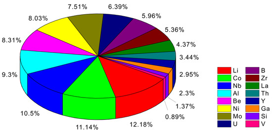The selected tracers exhibited an identification accuracy of 100% by testing the SIFT for accuracy using virtual mixing samples (step 4 as described in 2.2), so the geochemical tracers were used for sediment provenance. Because there were slight differences between each fitting result, the average result of 5 fittings was used as the final result of this research. The goodness-of-fit of the model reached 93.5%, indicating that the selected tracers can indeed trace the sediment sources with high reliability. Figure 4 shows the contributions of individual tracers to the model’s goodness-of-fit. Li, Co, Nb, Al2O3, and Be were the major contributors to the model’s goodness-of-fit, with the sum of these accounting for more than 50% of all tracer contributions.