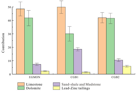 The contributions of the four sources to the catchment sediment samples, in each of the baseline project periods, were shown in Figure 5. Overall, the contributions of limestone and dolomite weathering were the most significant in the three periods, and the sum of their contributions was more than 80%. In EGMON, the contributions of limestone and dolomite were 48.5% and 41.9%, respectively, 49.9% and 30% in CGB1, and 42% and 41.6% in CGB2. By comparison, in EGMON and CGB1, the contributions of limestone was significantly higher than that of dolomite, although the contributions of the two were almost equal in CGB2. The contributions of limestone and sand-shale and mudstone increased between EGMON and CGB1, and then decreased from CGB1 to CGB2, while the opposite trend was exhibited by dolomite. The contributions of lead-zinc tailings pollution (5.9%) reached its highest level in CGB2. Since the contributions from all sources add up to 100%, the reduction of background lithology contributions leads to an increase in the contributions of lead-zinc tailings from CGB1 to CGB2. However, the results show that catchment sediments in the catchment mostly originated from regional background lithologies, while the contributions of lead-zinc tailings was relatively small.