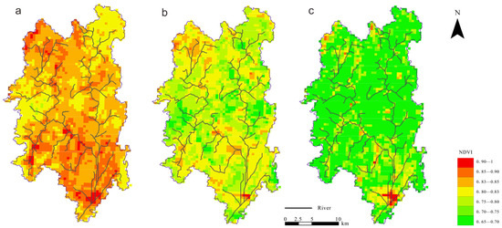 In addition to the background geology and geomorphology already discussed, land-use/vegetation change also plays an important role in the source changes of catchment sediments in karst areas. [41] studied the spatial and temporal variation of vegetation in the Guangxi Xijiang River catchment from 2007 to 2016, using MODIS EVI data, and found that the elevated vegetation index (EVI) generally declined during 2007–2011. One reason for this trend may be that during this time period, many severe natural disasters caused serious destruction of vegetation and crops, resulting in lower vegetation coverage. The EVI increased during 2011–2016, mostly due to vegetation protection measures such as afforestation and rocky desertification control projects in Guangxi (as shown in Figure 6). While human activities have little impact on high-altitude and steep terrain, soil loss in low-lying areas is vulnerable to changes caused by human activities involving land-use and vegetation [42]. Therefore, the contributions of the sand-shale, mudstone, and limestone, which are situated in relatively flat and moderately steep terrain, changed consistently with the land-use/vegetation in the study area, but the contribution of dolomite in the steep terrain areas did not. Consequently, the changes in sediment contributions between different time periods are closely correlated with the change in local land-use and vegetation cover.