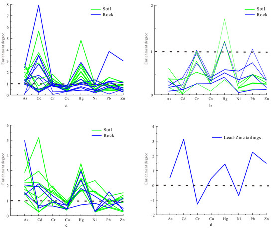 Degree of toxic metal enrichment in each sediment source. (a): Limestone; (b): Dolomite; (c): Sand-shale and mudstone; (d): Lead-zinc tailings (with logarithmic scale).