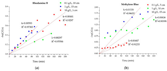 When a kinetics model is studied, the R2 value is used to ensure a good fitting of the model to the data. R2 can vary between 0 and 1, with the data having a better fit the closer R2 is to 1. Models that have an R2 > 0.9 are generally considered to be good in adaptation [54,55]. Thus, the only experiment not presenting a very good fit compared to the others is that of Brilliant Green, with a load of 10 g/L at a 10 cm distance from the radiation source, with R2 = 0.86439. On the other hand, the best fit is on the experiment using Rhodamine B, with a load of 1 g/L at a distance of 15 cm from the radiation source, with k = 0.00593 and R2 = 0.97383. In general, it is observed that Rhodamine B shows a better adaptation to linearity compared to the other two pollutants. In all cases of pollutants, it is concluded that at 10 g/L, the reaction rate constant, k, is higher than that of 0.1 and 1 g/L. When using Brilliant Green, the reaction rate constant at 10 g/L is 3.5 times higher compared to the corresponding value at 0.1 g/L, 2.7 times higher in the case of Methylene Blue, and only 2 times higher for Rhodamine B.