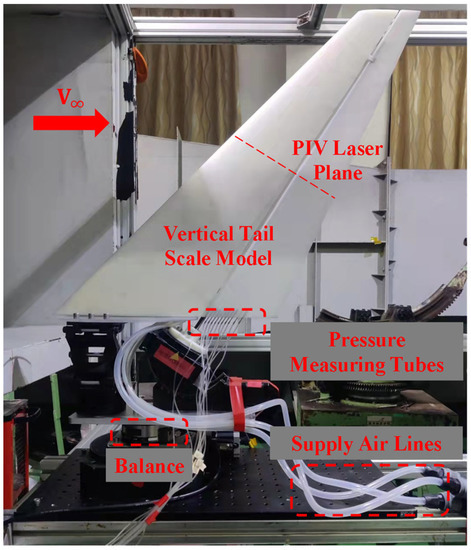 Therefore, in this paper, a scaled model of the vertical tail of a civil aircraft with an array of oscillating jet actuators is designed at 2.12 × 105 Reynolds number. The flow control law and mechanism of the vertical tail based on an oscillating jet are studied through force measurement, pressure measurement, and particle image velocimetry experimental methods.