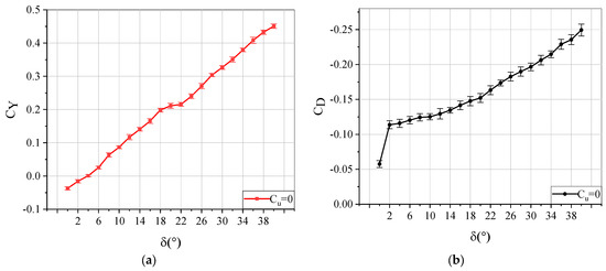 Aerodynamic curve of uncontrolled vertical tail model: (a) CY curve; (b) CD curve (β = 0°, Re = 2.12 × 105).