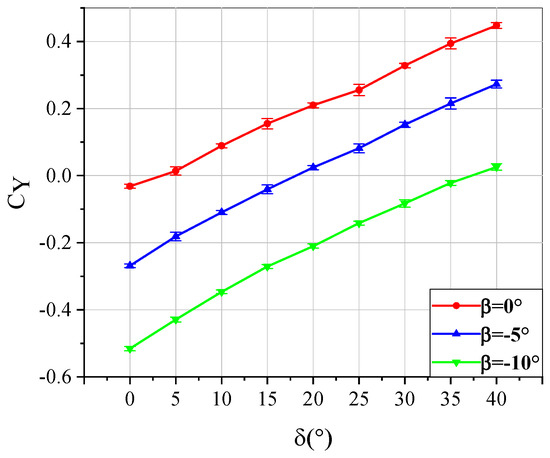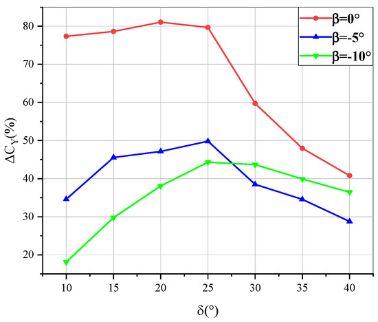 The study of the characteristics of the vertical tail lateral force under the typical conditions of −5° and −10° sideslip angles continued. Figure 7 shows the curve diagram of the lateral force coefficient of the vertical tail model under different sideslip angles when no control is applied. It can be seen that when the sideslip angle is −10°, the rudder deflection angle within the range of 0°~37° cannot produce the lateral force in the positive direction. This means that under this working condition, the vertical tail cannot balance the yaw moment caused by a large crosswind only by the rudder deflection, which is a huge threat to flight safety.