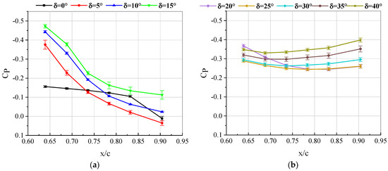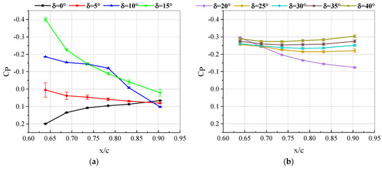 Rudder pressure distribution at different deflection angles: (a) δ = 0°~15°; (b) δ = 20°~40° (β = −10°, Re = 2.12 × 105).