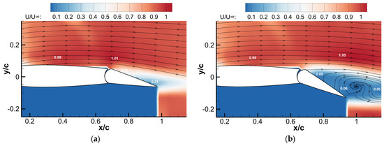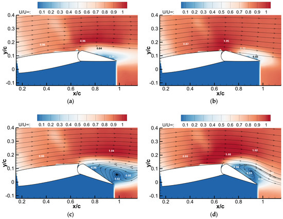 Velocity cloud diagram and streamline diagram of vertical tail upper surface: (a) Cμ = 0, δ = 15°; (b) Cμ = 0.332%, δ = 15°; (c) Cμ = 0, δ = 30°; (d) Cμ = 0.332%, δ = 30° (β = −10°, Re = 2.12 × 105).