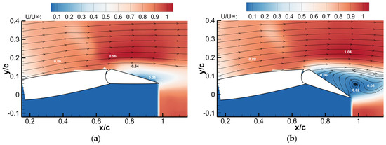 Velocity cloud diagram and streamline diagram of vertical tail upper surface without control: (a) δ = 15°; (b) δ = 30° (β = −10°, Re = 2.12 × 105).