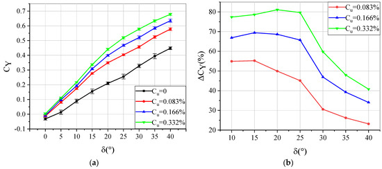 Lateral force coefficient and increment of vertical tail model under different momentum coefficient controls: (a) lateral force coefficient curves; (b) lateral force coefficient increment curves (β = 0°, Re = 2.12 × 105).