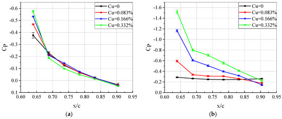 Figure 13 shows that β = 0° and Re = 2.12 × 105, the pressure coefficient curves of the rudder surface under different momentum coefficient jet controls when the rudder deflection angle is 5° and 25°. When the rudder deflection angle is 5°, there is attached flow on the vertical tail rudder. With the increase in the applied oscillating jet momentum coefficient, except for the increase in the negative pressure measured by the pressure-measuring hole near the outlet of the actuator, the downstream pressure coefficient changes little, and the rudder is attached. When the rudder deflection angle is 25°, the pressure coefficient curve without flow control shows an obvious “platform”, indicating that the airflow on the rudder is completely separated at this time. After the flow control is applied, a significantly increased negative pressure is measured at the pressure-measuring hole at the outlet of the actuator, and a “suction peak” appears. With the increase in the momentum coefficient of the oscillating jet, the negative pressure measured by the pressure measuring hole closest to the outlet of the actuator continues to increase, and the whole pressure coefficient curve shows an obvious slope. The pressure coefficient curves of the upper wing surface of the vertical tail are more “full”, which is reflected in the force measurement results of the aerodynamic force obtained by the surface pressure integration. The pressure coefficient curve of Figure 13b is consistent with the results of Melton’s [25] research. It proves that the pressure tap arrangement in this paper is reasonable and reduces the collection of unnecessary data. That is, the lateral force of the vertical tail increases. The measured pressure data are consistent with the measured force results, which show that the oscillating jet flow control can slow down or even eliminate the flow separation on the upper surface of the rudder, thereby increasing the vertical tail lateral force.