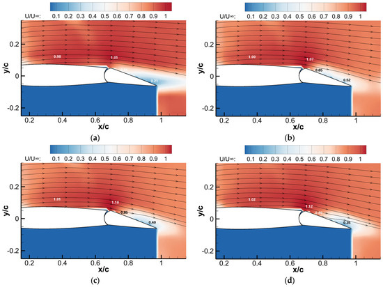 Velocity cloud diagram and streamline diagram of vertical tail upper surface under different momentum coefficient controls: (a) Cμ = 0; (b) Cμ = 0.083%; (c) Cμ = 0.166%; (d) Cμ = 0.332% (β = 0°, δ = 15°, Re = 2.12 × 105).