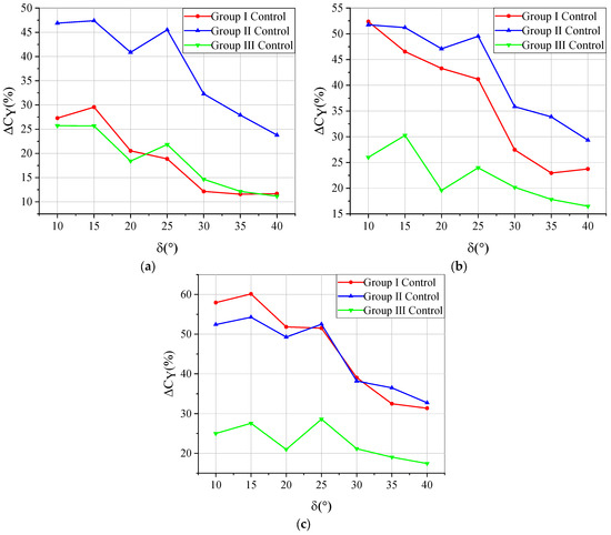 Vertical tail model lateral force coefficient increment curves under different control positions: (a) Cμ = 0.083%; (b) Cμ = 0.166%; (c) Cμ = 0.332% (β = −10°, Re = 2.12 × 105).