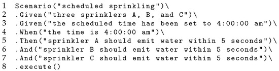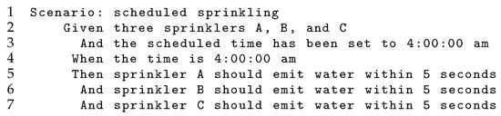 A plausible specification for capturing this requirement is by the Gherkin scenario of Figure 2. In this scenario, the three sprinklers have been set up (line 2), and the scheduled time has been set to 4:00:00 a.m. (line 3). When the scheduled time arrives (line 4), all three sprinklers should emit water within 5 s (lines 5, 6, and 7).
