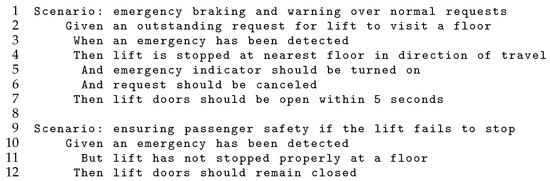 In Figure 3, two scenarios are used to specify the requirements. The first scenario (lines 1–7) stipulates that when an emergency has been detected (line 3), the first Then step requires for the lift to stop (line 4), give warning (line 5), and cancel outstanding requests (line 6). The next Then step (line 7) requires that the doors should be open after a short delay for the passengers to exit safely.