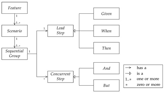 The class diagram in Figure 1 shows the syntactic structure of keywords of Gherkin. At the top level is the keyword feature, which represents a unit of functionality that the software under development will have upon completion [27], such as transferring money between two accounts in a banking application, booking a room in a hotel application, and so on. A feature contains a number of scenarios, where a scenario is a concrete example that describes how the feature plays out under the specific circumstance. For example, the behaviors of transferring money will be different, respectively, depending on the source account having a sufficient or an insufficient balance before a transfer.