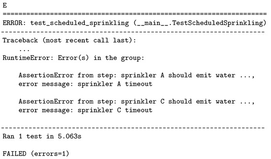To support the passing/failing semantics of a Then group, an assertion failure thrown by a step in the group is caught and stored by concurrentSpec. At the conclusion of executing the group, a RuntimeError exception is raised to show information of all failing concurrent steps. Figure 8 shows the screen dump of executing the scenario in Figure 5 with both sprinklers A and C clogged.