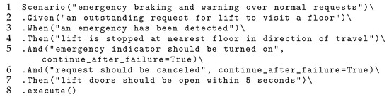 Table 6 shows the simulation results obtained by executing the specification of Figure 9 with concurrentSpec with keyword argument continue_after_failure = true for the warning step (line 5) and the cancellation step (line 6). If the lift stops at the nearest floor, the check for lift doors opening is correctly executed due to the keyword argument setting to continue after failure (Simulations 1–4). If the lift fails to stop, the check for lift doors opening is correctly skipped (Simulations 5–8) since the Then group fails and does not continue execution as a whole. Note that with the concurrency enhancement, the checks for warning and cancellation are executed simultaneously with the check for lift stopping. Thus, all checks are correctly made.