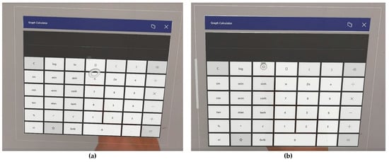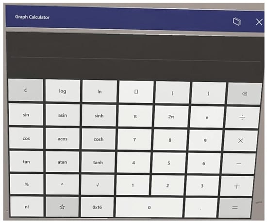 A Microsoft® Hololens 2 headpiece (Microsoft Inc., Redmond, WA, USA) was used. This device has been reported as the most commonly adopted one in the medical community to display virtual objects []. It has a weight of 566 g. The Windows Holographic Operating System was installed. The glasses use see-through holographic lenses. The resolution of the display is 2 k with 3:2 light engines. The holographic density is 2.5 k radians (light points per radian) or higher with eye-based rendering. This device tracks hand location and gestures using built-in cameras and a two-handed fully articulated model with directional manipulation. The world-scale positional tracking and real-time environment mesh are employed in the system for six-degrees-of-freedom tracking and spatial mapping purposes, respectively. The app Graph Calculator (Microsoft Inc., Redmond, WA, USA) was adopted for the pointing tasks.