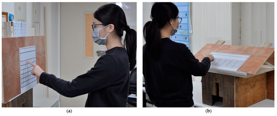 For the pointing tasks in the real environment, the calculator panels mimicked those of the virtual ones and were drawn on plastic boards. These boards were attached on a wood panel that was positioned on a workbench (see Figure 2). The inclined angle of the wood panel was also 30° or 90°. The sizes and distances of the keys and the angles of the panels between the virtual and physical settings were the same and were confirmed using a measuring tape.