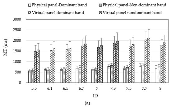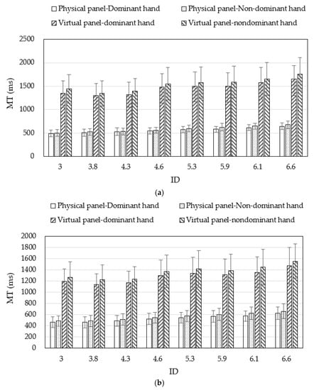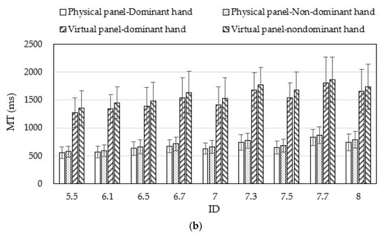 The regression coefficient d in Table 3 indicates the average extra amount of MT (755–1026 ms) required because the panel was a virtual one. The ratios of MT using the virtual panel versus the one using the physical panel may be calculated using our MT data. It was found that the participants needed to spend 2.23–2.79-fold more time on the MT, on average, to complete the pointing task on the virtual panel than on the physical panel under our experimental conditions. These numbers indicated the effects of the factor T and the inefficiency of using a virtual panel for data input. These results were consistent with the findings in the literature that pointing virtual objects required more time than pointing physical ones [].