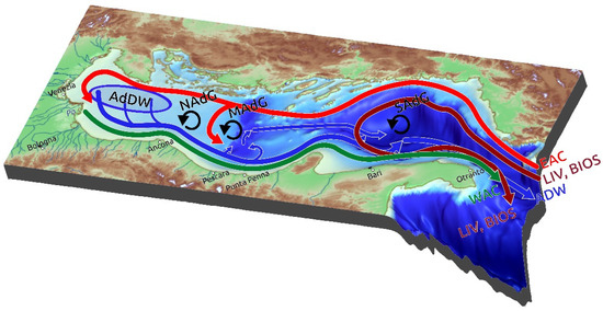 Bathymetric map of the Adriatic Sea showing the general circulation (from Spagnoli et al. [35]). Western Adriatic Current (WAC), Eastern Adriatic Current (EAC), North Adriatic Gyre (NAdG), Mid Adriatic Gyre (MAdG), South Adriatic Gyre (SAdG), Adriatic Dense Water (AdDW) North Adriatic AdW (NAdDW), Levantine Intermediate Water (LIW), Adriatic-Ionian bimodal oscillating system (BIOS).