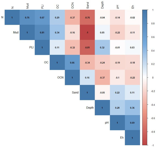 Correlation matrix of environmental variables. Total nitrogen [N], Pollution Load Index [PLI], Total Organic Carbon [OC], Total Organic Carbon/Total Nitrogen [OCN].