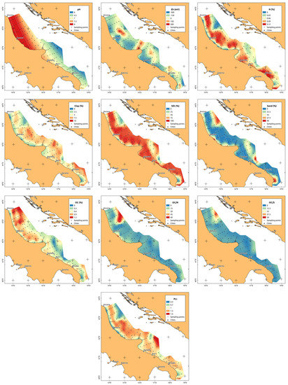 Interpolation map of the environmental variables (i.e., pH, Eh, Total Nitrogen [N], clay, silt, sand, Total Organic Carbon [OC], Total Organic Carbon/Total Nitrogen [OC/N], Total Organic Carbon/total Sulphur [OC/S] and Pollution Load Index [PLI]) in the central-southern Adriatic Sea.
