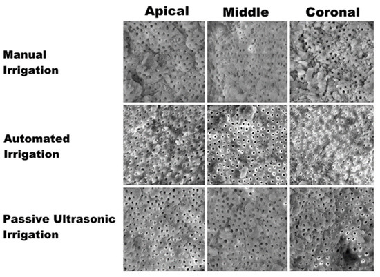 - Niu, W.; Yoshioka, T.; Kobayashi, C.; Suda, H. A scanning electron microscopic study of dentinal erosion by final irrigation with EDTA and NaOCl solutions. Int. Endod. J. 2002, 35, 934–939. [Google Scholar] [CrossRef]