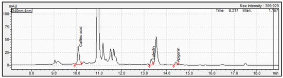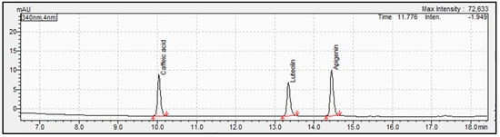 Determination of phenolic compounds was performed with the validated analytical method of HPLC-PDA (methodology is referred at Section 2.6). Figure 1 and Figure 2 show the profile of the phenolic compounds under evaluation for the sample and standard solution at 340 nm, respectively. Apigenin, luteolin, and caffeic acid were quantitively determined at 6.3 ± 0.2, 6.7 ± 0.2, and 1.8 ± 0.1 μg/g dry parsley, respectively.