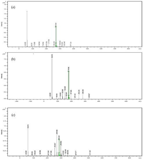 Mass spectrum of parsley extract samples at negative ionization were the precursor ion of apigenin—m/z 269 (a), caffeic acid—m/z 185 (b), and luteolin—m/z 285 (c) are obtained.