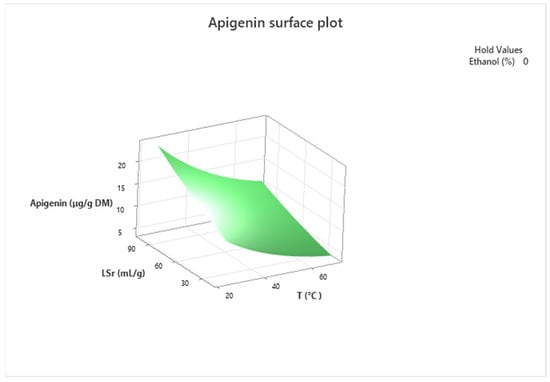 3D response surface plot of the apigenin (response variable) in μg/g of dry matter (DM) of parsley as a function of Temperature (X1) in Celsius degrees (°C) and ratio of solvent to dry parsley (LSr) in mL/g while holding ethanol at 0% (v/v).