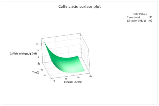 3D response surface plot of the caffeic acid (response variable) in μg/g of dry matter (DM) of parsley as a function of Temperature (X1) in Celsius degrees (°C) and ethanol concentration in % v/v while holding time at 35 min and ratio of solvent to dry parsley (LSr) at 100.