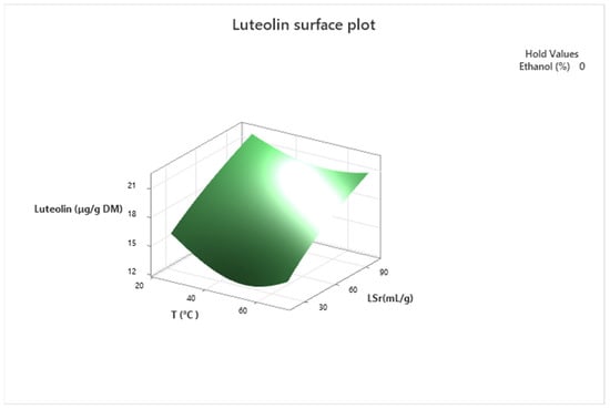 3D response surface plot of luteolin (response variable) in μg/g of dry matter (DM) of parsley as a function of Temperature (X1) in Celsius degrees (°C) and ratio of solvent to dry parsley (LSr) in ml/g while holding ethanol at 0% (v/v).