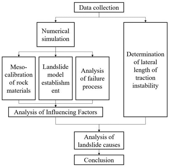 Deformation types of landslides generally include retrogressive landslide, load-caused landslide, and complex landslide [1,2]. Among them, retrogressive landslide is a process of backward progressive failure [3,4,5]. Due to slope erosion, or artificial slope cutting, the slope surface is deformed and unstable, and the lower rock mass first slides, and then gradually forms cracks from bottom to top [6,7]. With the development of deformation, the rock mass on the upper part of the slope loses support and slips [8]. Retrogressive landslides mostly occur in sloped areas composed of sedimentary layers, fault zones, weathering zones, and weak interlayers of rock and soil. The main sliding bodies are unconsolidated layers, weak interlayers, or ancient landslides, creep bodies, etc. [9,10,11]. When building expressways in mountainous areas, many sections of the road are constructed by removing the foot of the slope. Due to the man-made destruction of the foot of the slope, retrogressive landslides are easy to occur under the action of long-term natural forces (gravity forces). As a geological hazard, retrogressive landslide has the characteristics of wide distribution, high frequency, and great harm, which poses a major threat to engineering construction and people’s property safety [12,13,14]. Many scholars have done a lot of research work on retrogressive landslide [15,16,17]. Lin et al. [18] proposed a simplified numerical method for the prediction of rainfall-induced retrogressive landslides, which can effectively reduce the harm caused by retrogressive landslides caused by rainfall. Marko et al. [19] investigated the Audru landslide in detail and studied the influence of various modeling parameters on the overall slope stability. Lin et al. [20] carried out slope model experiments by filling an experimental flume with unsaturated fine sand and an artificial rainfall simulator and summarized the mechanism of rainfall-induced retrogressive landslides. At present, the research on retrogressive landslide generally uses indoor experiments or engineering cases to carry out qualitative analysis on its failure mode [21,22,23]. In order to control the retrogressive landslide and treat it [24,25,26], it is necessary to determine the instability range of the retrogressive landslide. As the retrogressive landslide is sliding from top to bottom, the slope will slip and crack to form numerous irregular slides. The reasons for the formation of these sliders and the range of the number of sliders need to be further studied. The length of the first sliding block formed by the retrogressive landslide is called the lateral length of traction instability, which is the distance between the bottom instability slip surface from the excavation surface to the trailing edge crack. In this paper, relying on the actual highway retrogressive landslide, the particle flow discrete element is used to analyze its failure mode, and the lateral length of traction instability is calculated through the stability theory of the sliding pull-crack failure slope, and the traction instability range of the retrogressive landslide is determined, and the influence of various rock parameters on the lateral length of traction instability is analyzed. The technical flow chart is shown in Figure 1.