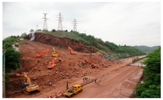 In May 2012, a rare continuous rainstorm occurred on the Luxi section of the Changde-Jishou Expressway in Hunan Province. A landslide occurred on the left upper slope of the K177 + 040~K177 + 115 section of the Changde-Jishou Expressway, as shown in Figure 2. A large amount of soil covered the highway, resulting in serious traffic jams in both directions, and major safety risks such as secondary landslides in the mountains and power cuts on high-voltage lines [27]. After geological investigation, it was found that the landslide was a retrogressive landslide [28,29], that is, the slope body showed a failure mode of segmented decline when sliding.