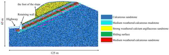 The slope model is 125 m long and 65 m high, the foot of the slope is 88°, the dip angle of bedding is 25°, and the total number of particles is 109,836.