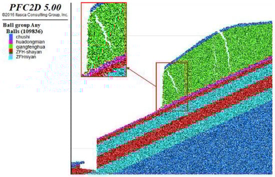 At 37,500 time-steps, the slope begins to break, as shown in Figure 8. From the grouping of particles in the model, it can be seen that the planting soil part on the upper part of the slope and the strongly weathered calcium argillaceous sandstone began to slide along the sliding surface, and two obvious tension cracks appeared. One appeared in front of the slope, about 4.54 m away from the foot of the slope, which was the first part to crack. The other appeared in the middle of the slope, and gradually expanded from the foot of the slope. The overall displacement and velocity of the slope are small, which is due to the artificial removal of the foot of the slope to form a free surface. Under the action of gravity, the slope body undergoes shear creep in the direction of the free surface.