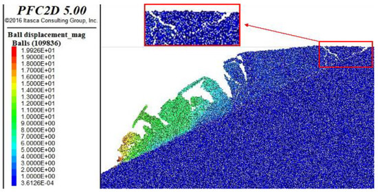 PFC2D continues to run, resulting in Figure 9. At this point, damage occurs in the middle of the slope. With the increase of displacement, the middle part of the slope is pulled and cracked into several blocks, and five pull-crack cracks penetrate the front and middle part of the slope. The displacement of the slope gradually increases from top to bottom, and the maximum displacement of particles in the lower part of the slope reaches 12.57 m. At this time, the rock mass on the upper part of the slope has not slipped yet. It can be seen that the speed of particles in different parts is different, which is a ladder-shaped distribution. The front particles of the slope body have a fast speed, constantly dragging the rear particles, showing obvious displacement segmentation. This is because the lower part of the slope slides downward due to the failure of particle adhesion, causing the upper part of the particle to lose support and generate downward acceleration and kinetic energy, pushing the particles in the front of the slope to continue to slide forward. It can be seen that when the particle adhesion force is large, the rock mass will not fall completely apart when a landslide occurs, but rather slides down as a coherent block.