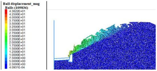 The numerical simulation of the slope was completed, and Figure 11 was obtained. The slope has completely collapsed. The displacement of the upper particles is the largest, and the displacement of the lower particles is relatively small. This is due to the sliding of the rock mass at the front edge of the slope; shear failure occurs in the middle of the slope, the rock mass at the rear edge loses its support and slides downward, and the stress on the upper particles of the slope is greater than that of the lower particles, resulting in a significant change in the displacement of the upper particles of the slope. At this time, the rock mass at the front edge of the slide slides forward through the retaining wall to the model highway. At this time, the maximum displacement of the rock particles reached 43.822 m.