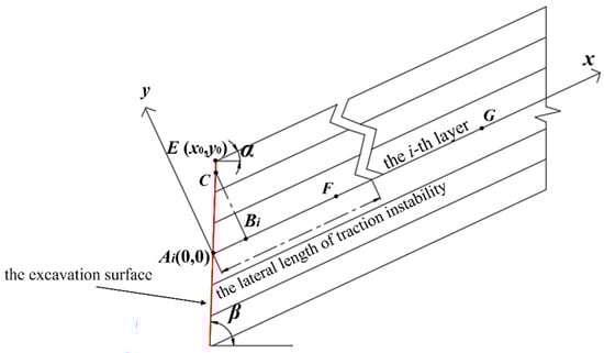 During the construction of the slope, due to the effects of rainfall, the removal of lateral constraints, blasting [56], and other factors, the rock mass structure in the local area of the slope is destroyed, thereby reducing its mechanical index. The mechanical principle is complex, and it is very difficult to describe this process accurately and completely. Assuming that the bottom surface of the rock mass in layer i is a weak surface after the slope is excavated, the rock mass of the slope will slide along this bottom surface. For slopes whose excavation slope angle is greater than the dip angle of bedding, because of the removal of material by excavation, the failure mode of the slope may be a complete sliding failure along a certain level, or it may slide along certain levels. During the sliding process, some joints in the rock mass are pulled apart, showing gradual sliding failure from bottom to top. For the slope with the natural slope angle equal to the dip angle of bedding, the slope calculation model shown in Figure 12 is established. Let the dip angle of bedding be α and the excavation slope angle be β. The x-axis position of the coordinate system is taken as the bottom surface of the studied block and changes with the change of the studied block. The origin of the coordinate is located at the intersection of the bottom surface of the studied block and the excavation surface. Let the origin of the coordinates be Ai, C is a point on the excavation slope, and the intersection of the vertical line and the x-axis is Bi. E is the apex angle of the slope and let its x and y coordinate values be x0 and y0. F is any point on the bottom of the i-th layer. The distance from G to the origin of the coordinate system is L0. L0 is the width of the weakening area of the mechanical parameter, that is, the length of the influence area of the incised slope is L0. L0 is related to factors such as construction methods, rock mass unloading, and weathering, and can be determined according to engineering experience.