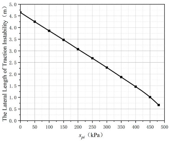 Figure 14 shows the later length traction instability as a function of Spi (equivalent tensile strength of rock masses above the i-th layer that are not affected by excavation). It can be found that the curve is close to a straight line, which is a linear relationship. The influence of Spi on the lateral length of traction instability is relatively small, and it decreases by 0.8 m for every 100 kPa length increase. When Spi = 0 kPa, the lateral length of traction instability is the largest, which is 4.65 m. When Spi = 480 kPa, the slope is in a state of ultimate equilibrium.