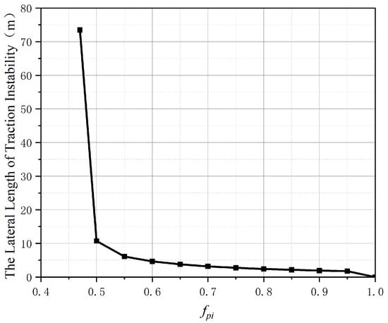 Figure 16 shows the later length traction instability as a function of fpi (the friction coefficient of the bottom surface of the i-th layer that are not affected by excavation) [59,60]. The curve is almost at a right angle, as shown in Figure 16. When fpi > 0.5, the curve is relatively flat; when fpi < 0.5, the traction instability length increases sharply, and it reaches 73.5 m only when fpi = 0.47. This happens because the fpi is too small, resulting in the direct instability of the slope, and the upper rock mass will slide along with the lower rock mass of the slope without the phenomenon of segmented collapse. The lateral length of traction instability measured at this time is meaningless.